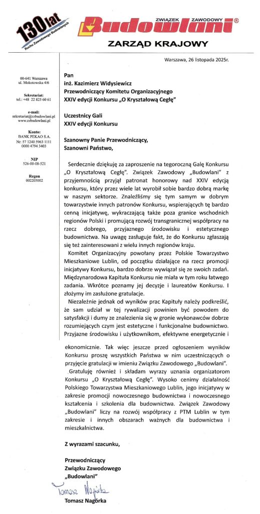 Patronat nad XXIV Edycją Konkursu „O Kryształową Cegłę” objął Związek Zawodowy Budowlani